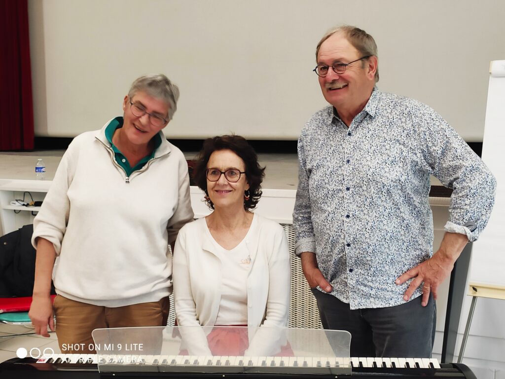 Sous la direction d’Anne Bien, cheffe de notre chorale Mosaïque, tous les choristes ont fait la mise en voix : une préparation physique (respiration, postures, échauffement) et ensuite la préparation proprement vocale. Par exemple, commencer par un souffle SSSSSSSS qui peu à peu se transforme en ZZZ, avec un son de la hauteur qu’on veut ; passer de FFFF à VVV, en tâchant d’entendre les sons que produisent les autres choristes. Ou encore une mélodie toute simple, sur une seule voyelle, puis sur une autre voyelle, et ensuite, chacun choisit sa voyelle. Avec des variations de hauteur pour que les choristes élargissent leur tessiture. Après la pause de midi, c’est Gérard Legoupil, le chef de choeur du Fuilet qui a remis le groupe en jambes voix avec une vocalise sur ninanénunênonon !